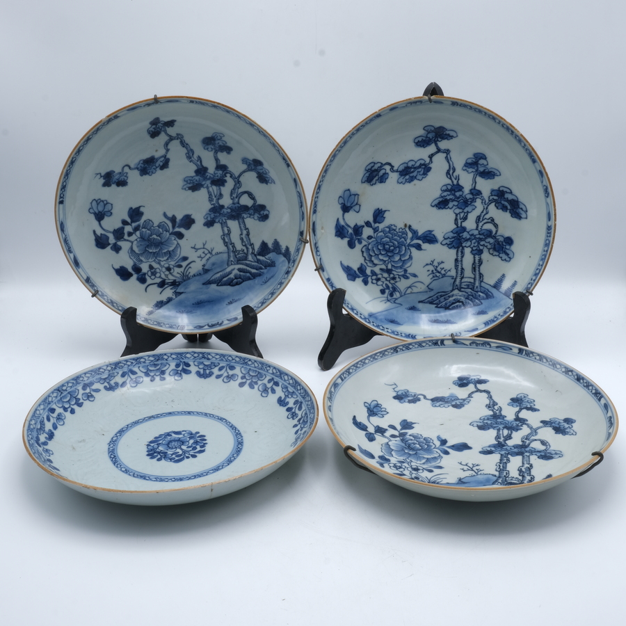 Vier diepe 18e eeuwse Chinees porseleinen schotels. Blauw/wit met florale motieven, waarvan drie vmet het zelfde patroon. Qianlong periode.