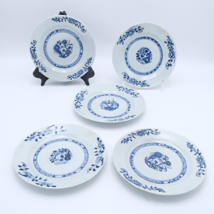Lot van vijf 18e eeuwse Chinees porseleinen bordjes met blauw-wit floraal decor, Qianlong periode (1735-1796)
