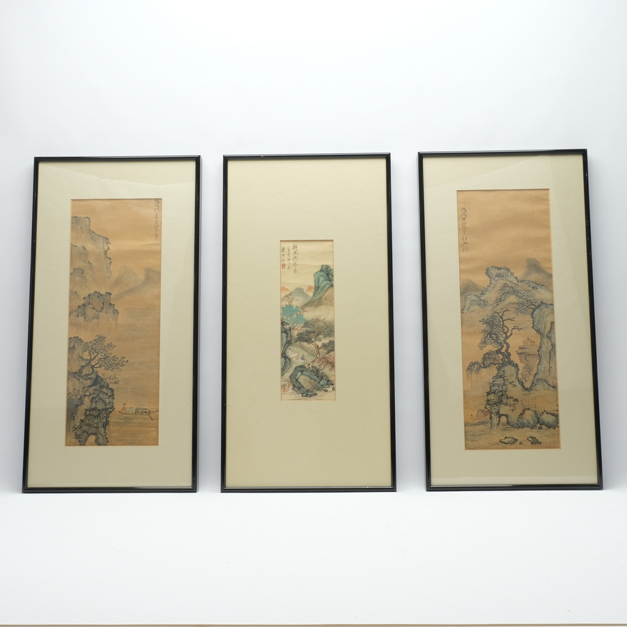Lot van drie 20e eeuwse Chinese schilderijen, voorstellingen van bergen in landschap. Allen met kalligrafie,