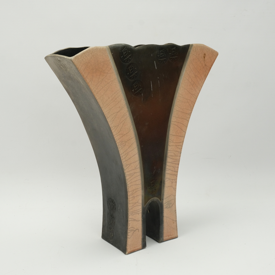 Een 20e eeuwse raku keramieken vaas versierd met Chinese tekens.