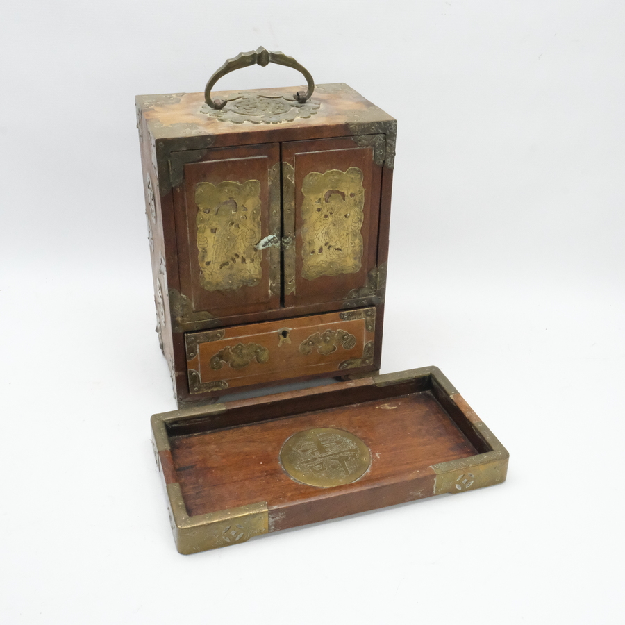 Een jaren ’20 of ’30 Chinees sieradenkastje met binnenin vier lades. Met daarbij een Chinees houten dienblaadje