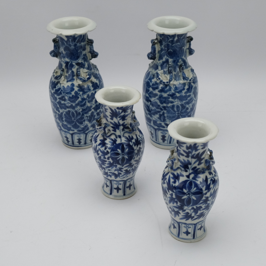 Lot van vier 19e eeuwse Chinees porseleinen vazen met onderglazuur blauw-wit floraal decor en in reliëf decor van salamanders. Hoogte 15,5 en 20,5 cm. Ongemerkt.