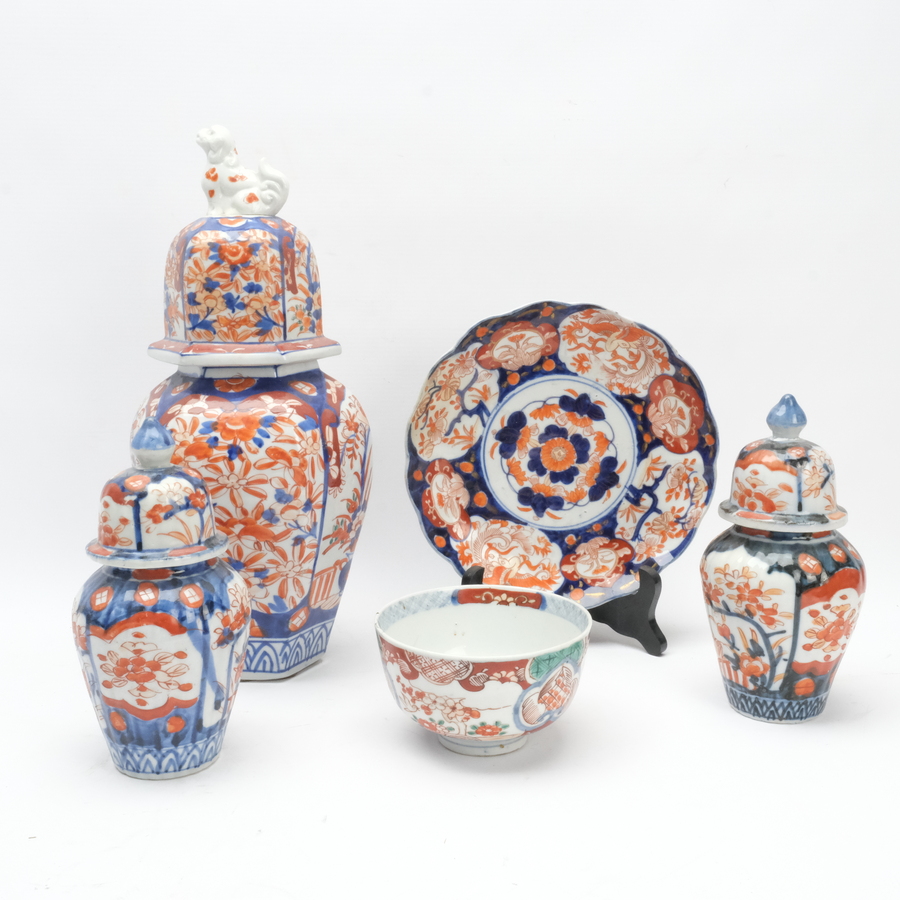 Lot van vijf stuks Japans 19e eeuws imari: een grote dekselvaas, 33,5 cm hoog, twee kastvaasjes, 18 cm hoog, één knop gelijmd en restauratie aan rand deksel, een kom, doorsnede 12 cm, met twee h...
