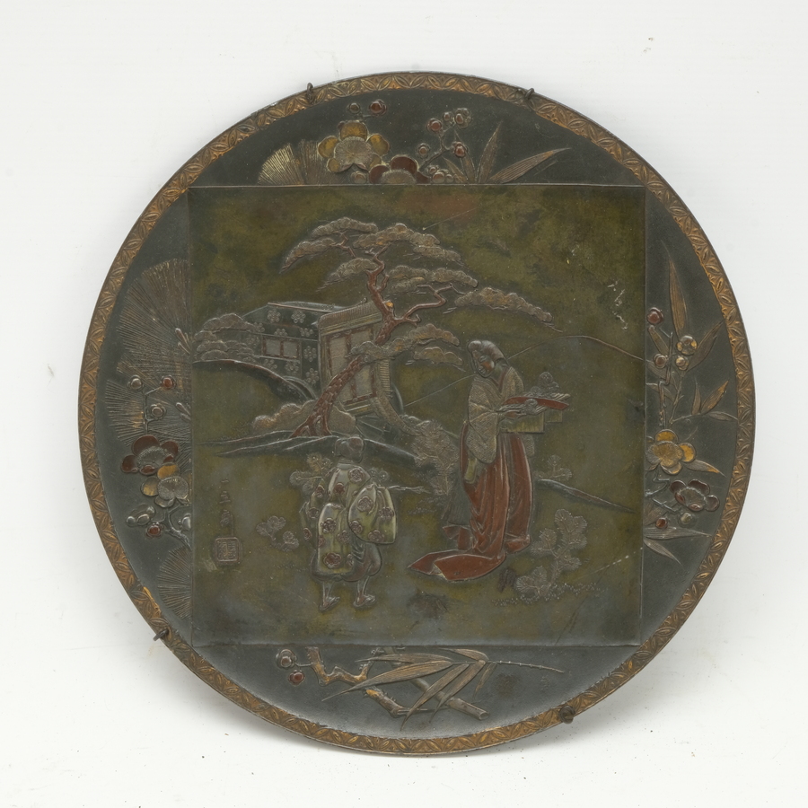 Een gepatineerd Frans metaal legering schotel. Met een decor Geisha in Oosterse tuin en een bloemenrand. Naar een Japans bronzen voorbeeld.