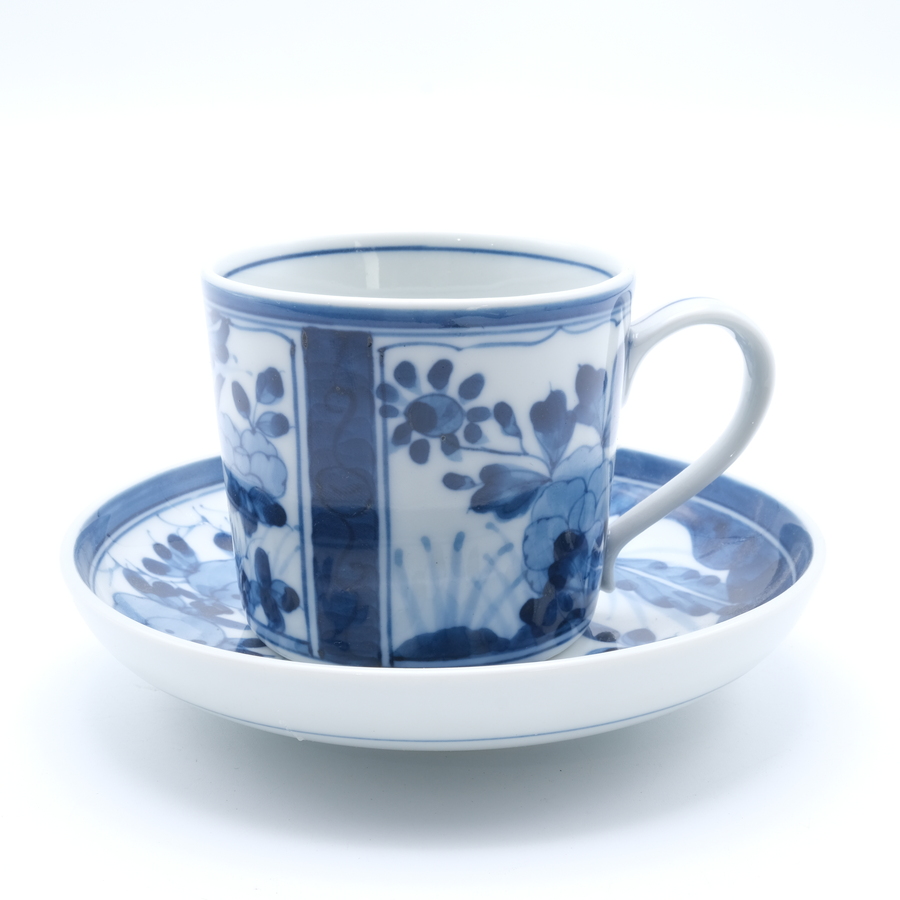 Een 20e eeuws Japans kop en schotel, blauw-wit met VOC logo.