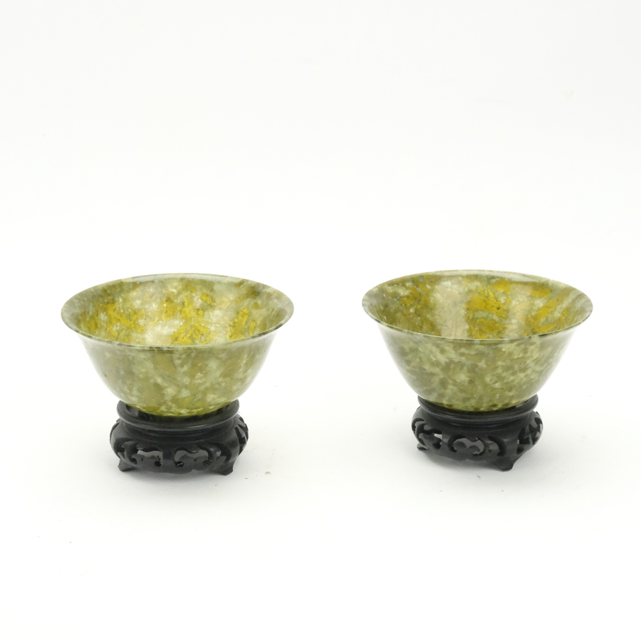 Twee Chinees uit groen mineralen (zgn Spinace jade) gestoken kommen op houten sokkels. 20e eeuws of ouder.