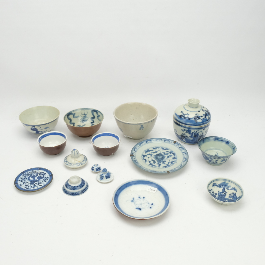 Een lot met diverse Chinees en Japans Blauw/wit porselein, bestaande uit oa kommen, schotels en deksels.