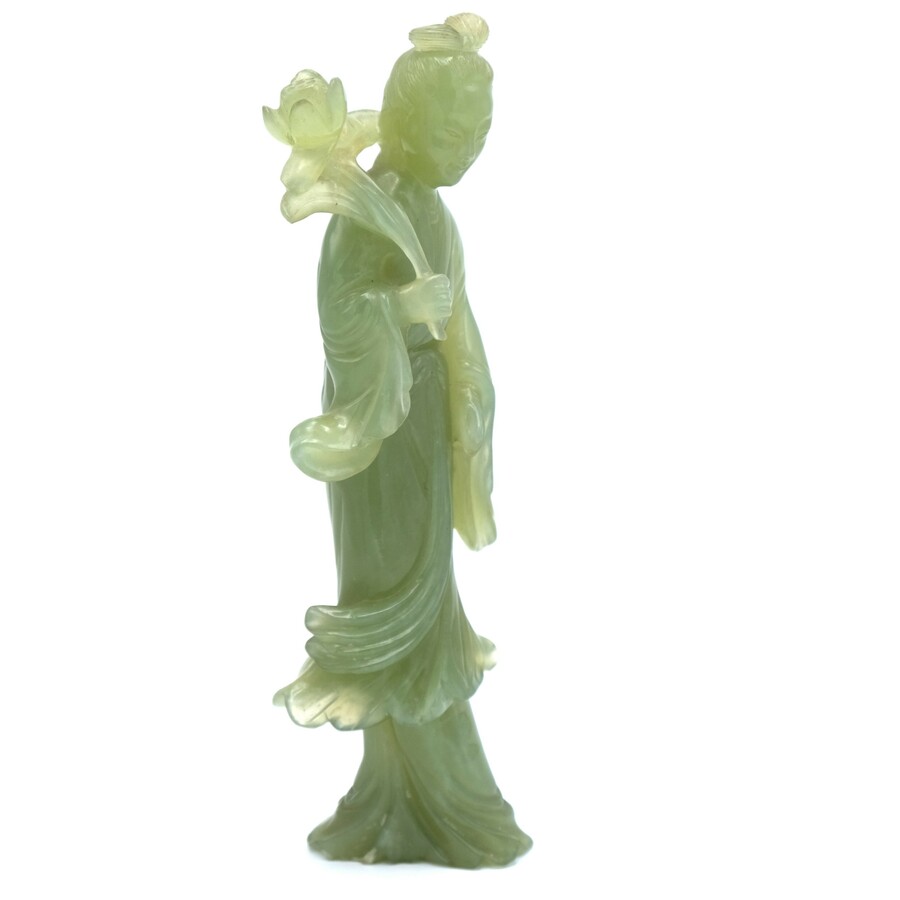 20e eeuws Chinees gestoken jade beeldje, voorstelling van een quanyin met een bloem in de arm