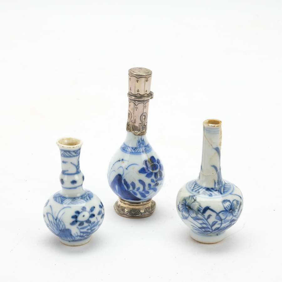 Lot van drie antieke 18e eeuwse Chinese miniatuurvaasjes: een knobbelvaasje, een pijpvaasje en flesvaasje met antieke 19e eeuwse zilveren monturen