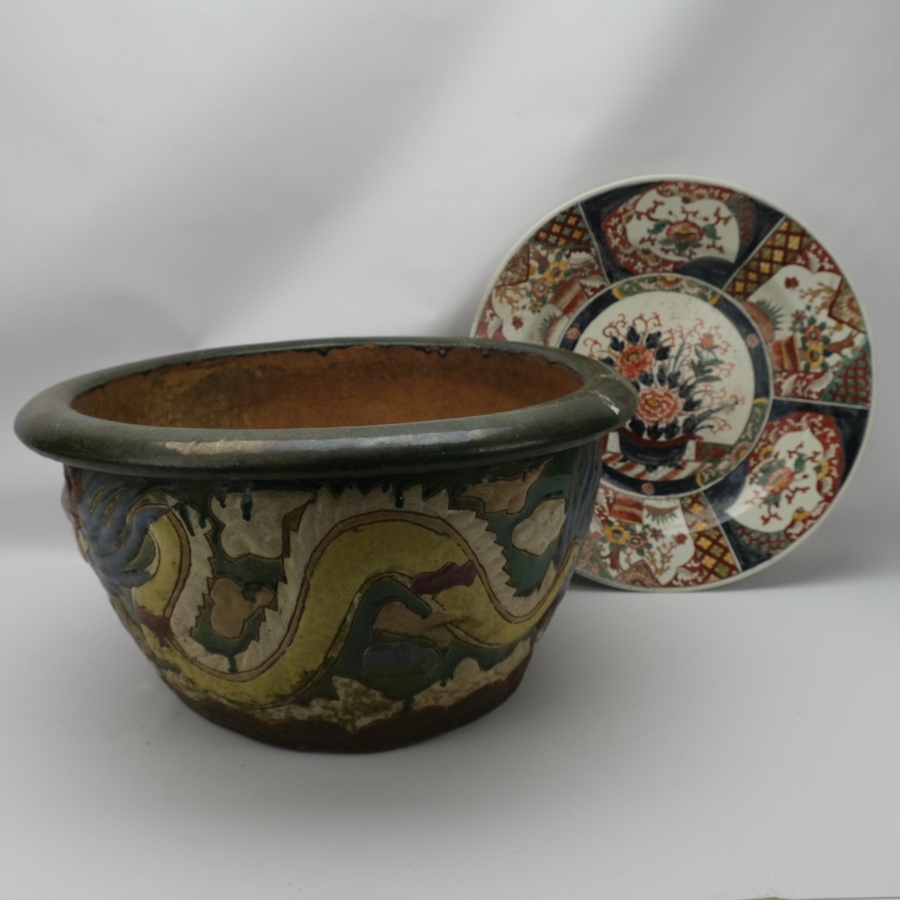 Chinese bloempot en grote gekleurde Oosterse schotel.