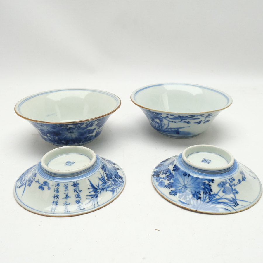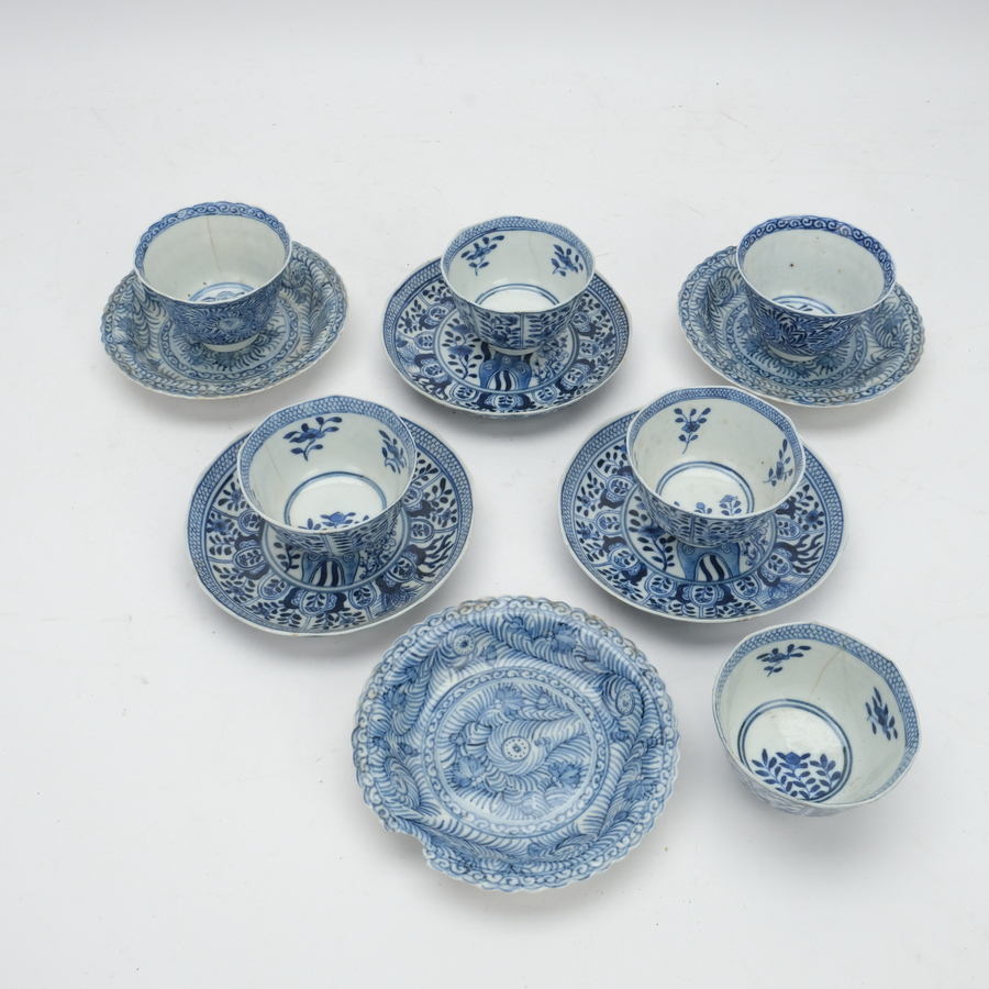 Lot van zes antieke Chinees porseleinen kop en schotels. Vier met blauw-wit decor, gemerkt met vierkaraktermerk. Kangxi revival, laat Qing, 19e eeuws. Met daarbij nog twee 19e eeuwse kopjes en ...