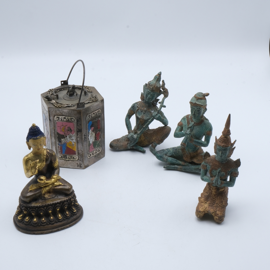 Lot diverse aziatica: drie Thaise bronzen tempelwachters, een bronzen Boeddha en een Chinees trekpotje met emaille versiering