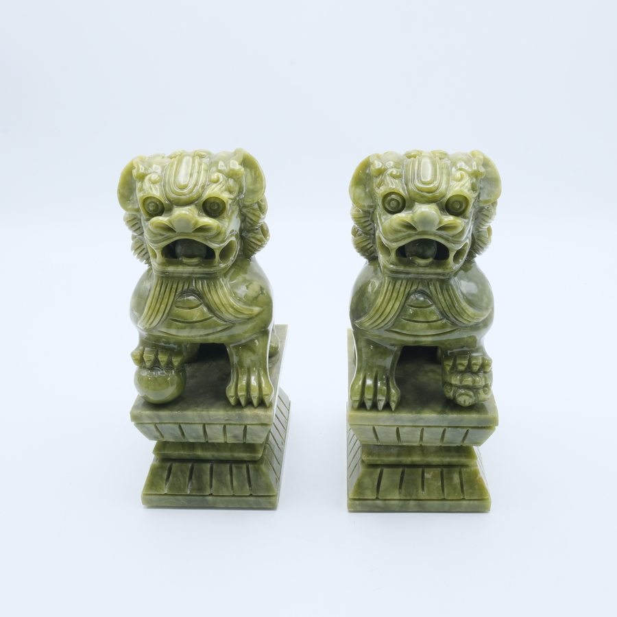 Lot van twee groen stenen Chinese sculpturen, tempelleeuwen. 20 cm hoog