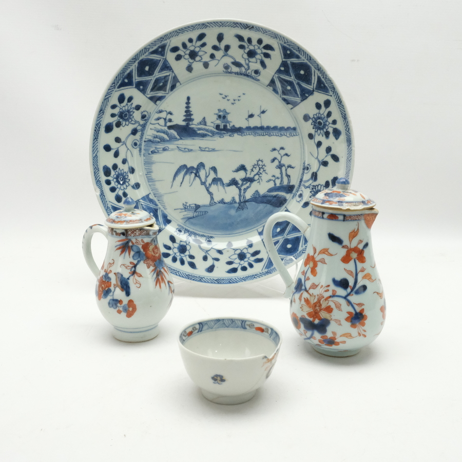 Lot van twee 18e eeuwse Chinees imari porseleinen melkkannen met deksels. Met daarbij een imari kommetje en een 18e eeuws blauw-wit bord met landschapsdecor