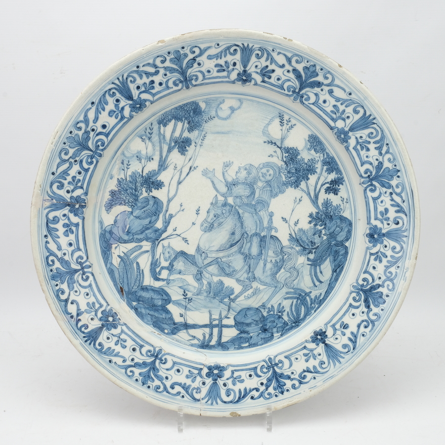 Een 17e eeuwse aardewerken schotel, met blauw-wit decor van man en vrouw op paard. Op de achterzijde gemerkt met vuurtoren = Savona, Ligurije.
