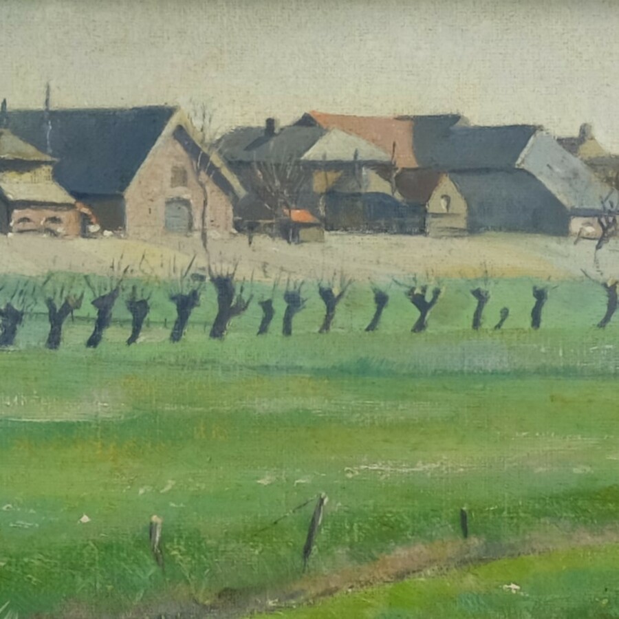 Schilderij, olieverf op doek/marouflé. Op de achterzijde getiteld 'Aan de IJssel'. Rechtsonder gesigneerd Evert Bomhoff (Zwolle 1886 - 1949).