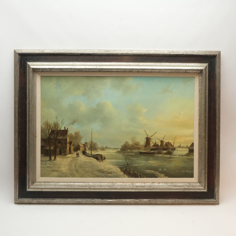 Schilderij, 40 x 60 cm. Romantische voorstelling met molens bij een vaart. Linksonder gesigneerd Peter Sterkenburg (Harlingen 1955 -Zurich 2000)
