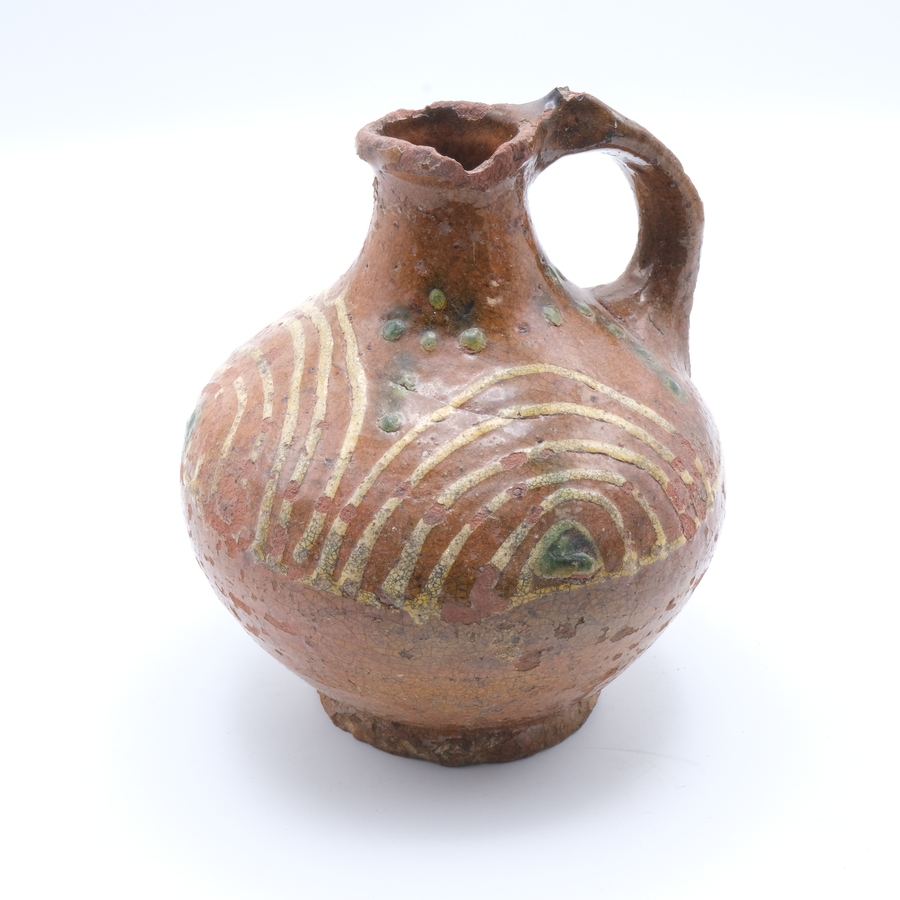 Een 17e eeuwse bruin aardewerken oliekan met ringeloor decor.