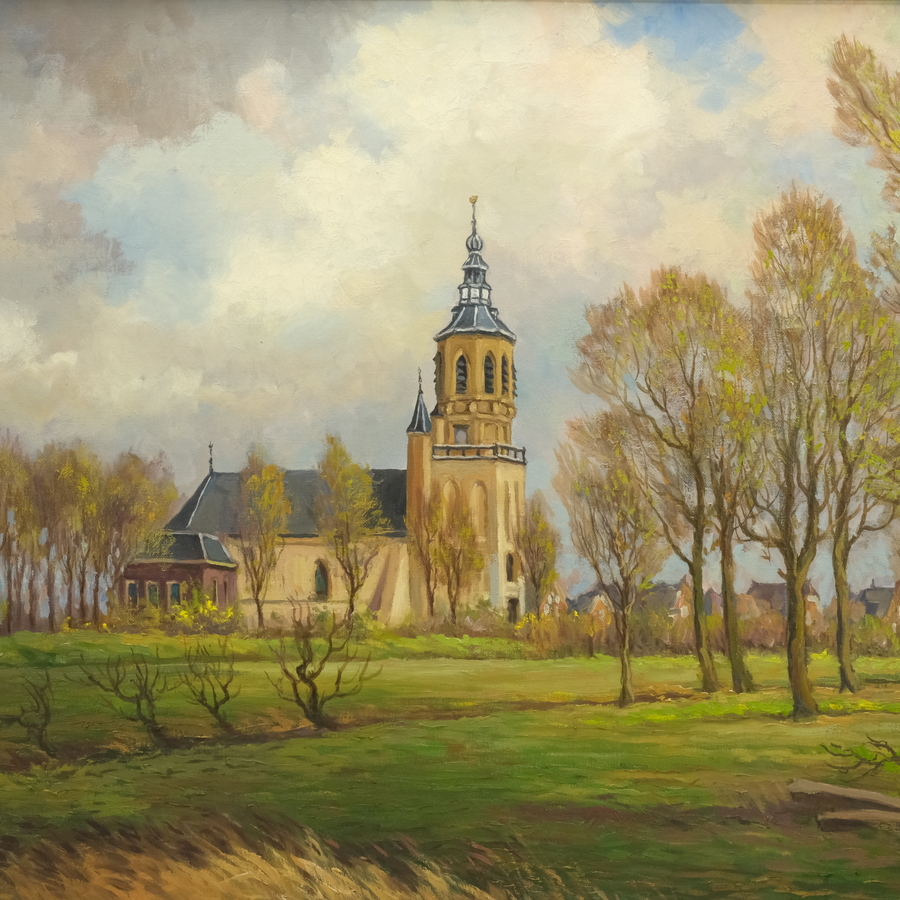 Schilderij, olieverf op doek. Gezicht op de kerktoren van Dronrijp met daarvoor de boerderij van Bouke Wielinga. Rechtsonder gesigneerd Sjoerd de Vries (Franeker 1909 – Alkmaar 1996), gedateerd ...