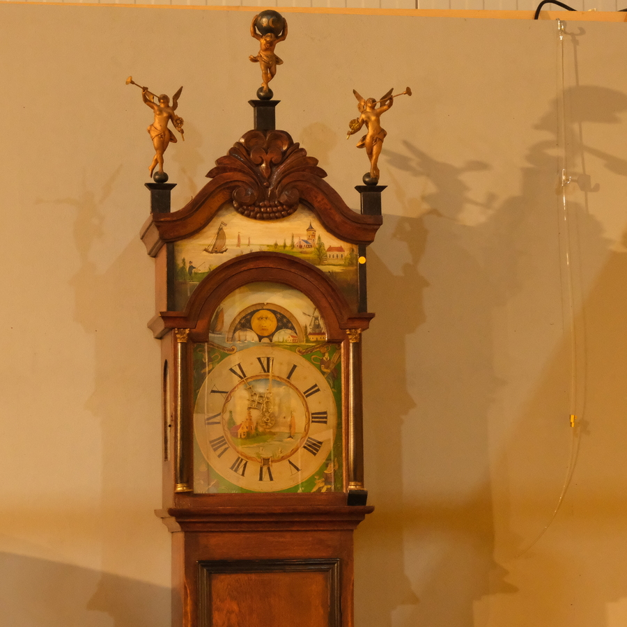 Een 19e eeuws Fries staand horloge, mahoniehouten gefineerde kast, dubbele kap met beschilderde raampjes, beschilderde wijzerplaat met maanstand, bekroond met houten Atlas en bazuinblazende enge...
