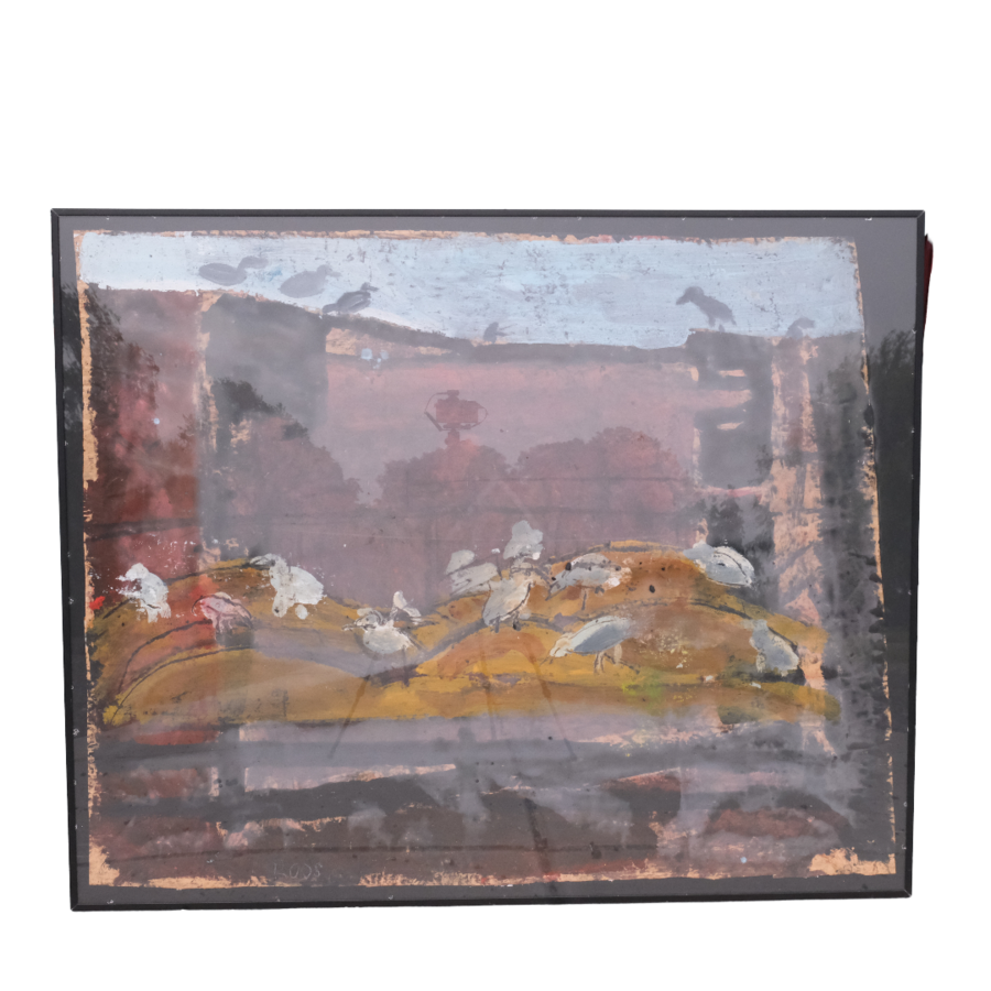 Schilderij, acryl op papier. Kadaverschip in Harlingen tijdens uitbraak mond-en-klauwzeer. Gesigneerd Jan Roos (1951), gedateerd 2002