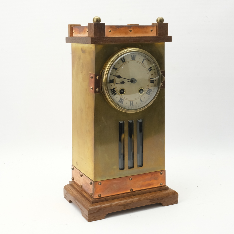 En geel- en roodkoperen Nieuwe Kunst pendule op eikenhouten basement, ca. 1910