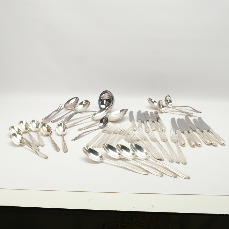 Een jaren '50 zespersoons verzilverd bestek, 39 delen. Enkele delen ontbreken. Ontwerp Gustav Beran (Wenen 1912 - Bern 2006) voor Keltum, model P3. Met daarbij enkele andere stuks verzilverd bes...