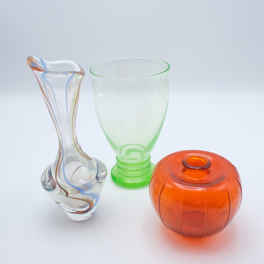 Een art deco annagroen glazen vaasje, zgn. ‘tomaatje’. Ontwerp W.J. Rozendaal voor Kristalunie Maastricht. 8 cm hoog. Met daarbij een bruin glazen vaasje