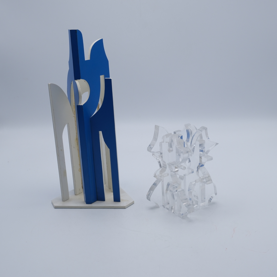 Twee perpex design vormstukken. Moderne abstracte voorstellingen. Een blauw/wit en een helder exemplaar