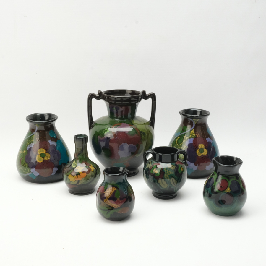 Een lot met zeven stuks Gouds glansplateel. Bestaande uit diverse vaasjes, waaronder twee met oren. Van verschillende plateel fabrieken.