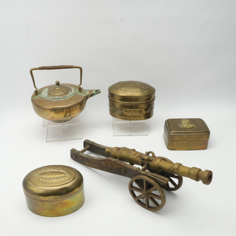 Een lot met vijf stuks messing artikelen, bestaande uit een theeketel gemerkt voor Jan Eisenloeffel (Amsterdam 1878- Amsterdam 1957). Twee theedozen en kanon op houten onderstel.