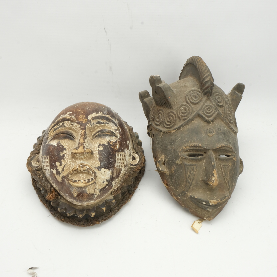 Twee houten Afrikaans houten maskers waarvan één wit geschilderd en één met hoofdtooi. Afkomstig uit Nigeria en Cameroen