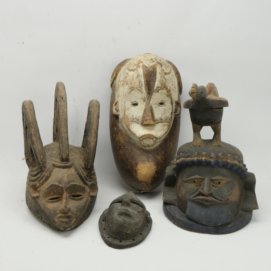 Lot met vier Afrikaans houten maskers. Twee met beschilderde gezichten. Uit oa Nigeria