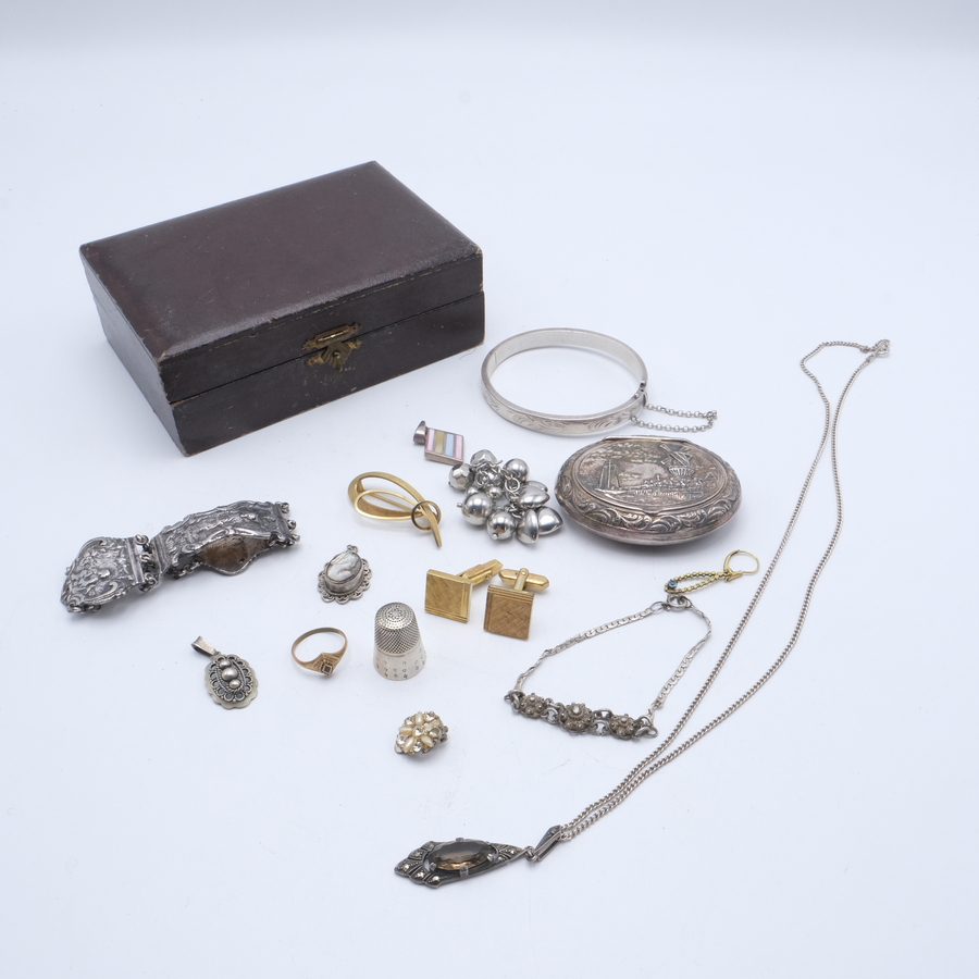 Sieradenkistje gevuld met diverse sieraden, waaronder een zilveren armband en een armband gemaakt van bijbelslot.