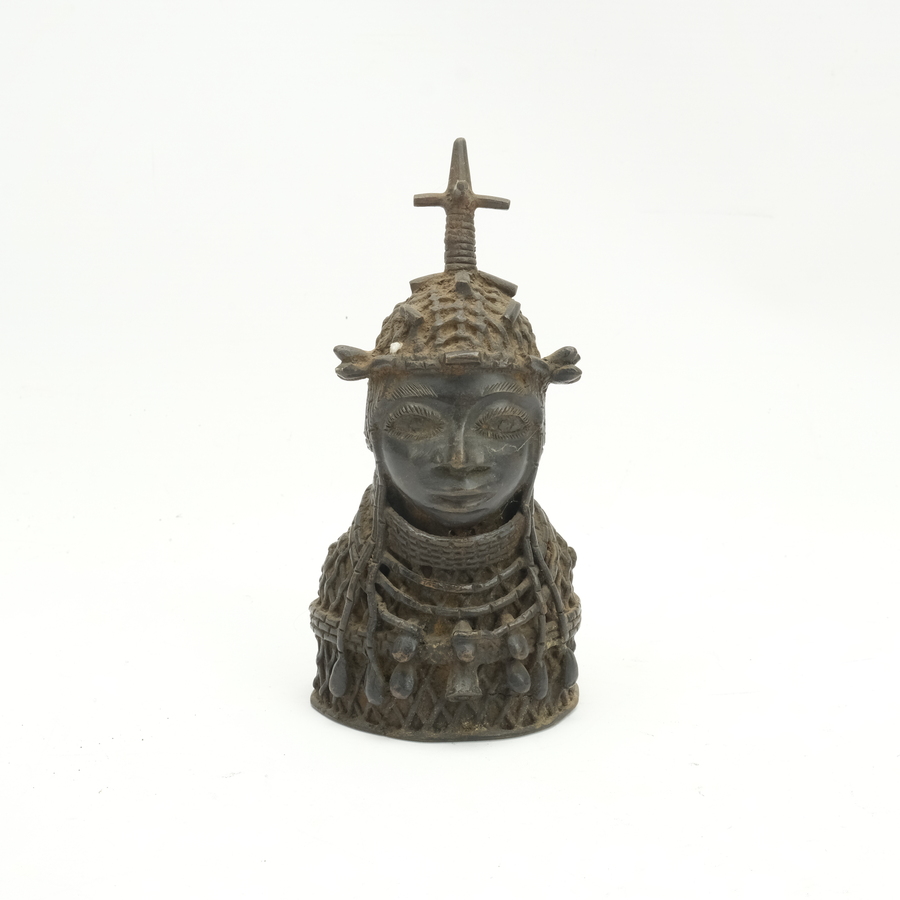 Een Benin bronzen buste van een figuur met diverse colliers en hoofdtooi, Zgn Head of Oba, altaarhoofd. 20e eeuws