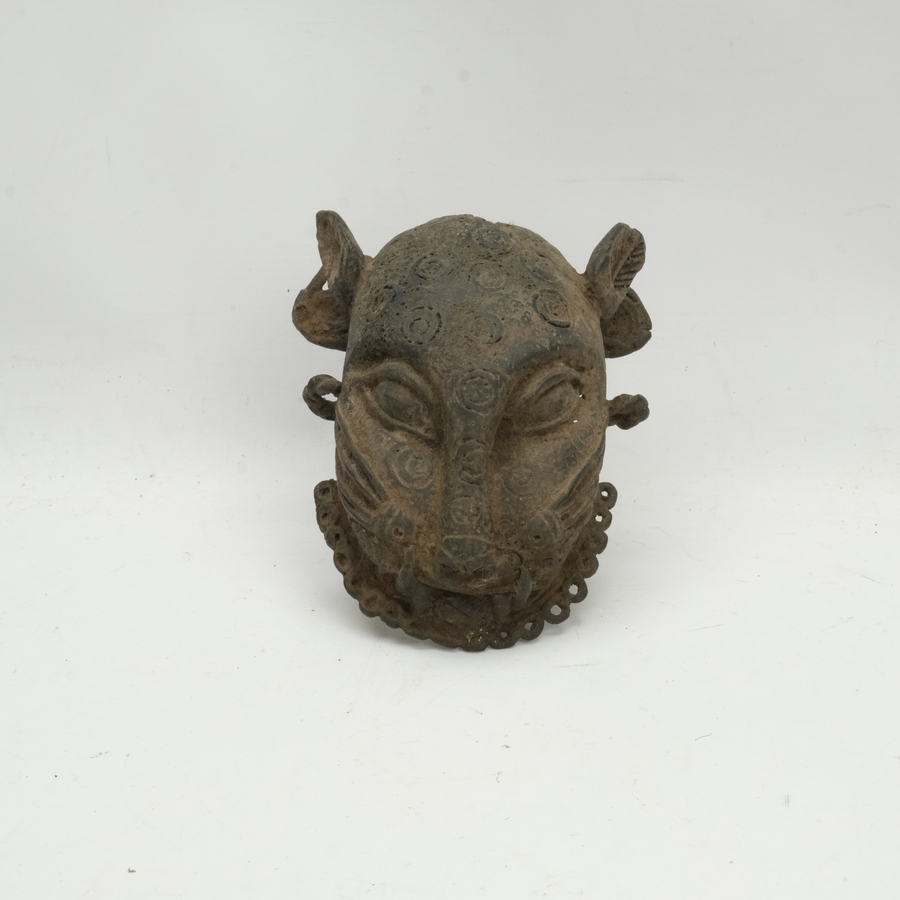 Een Benin bronzen masker van een luipaard, 20e eeuws.