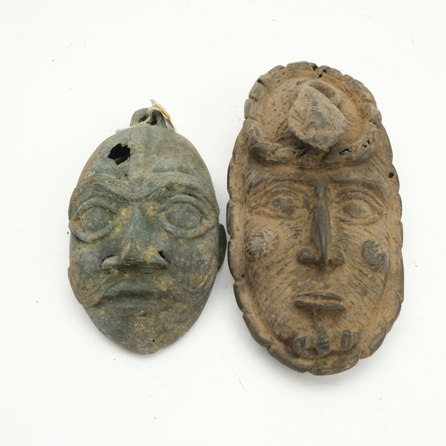 Twee Benin bronzen wandmaskers. Gezichten, waarvan één met hooftooi en een andere met snor. 20e eeuws
