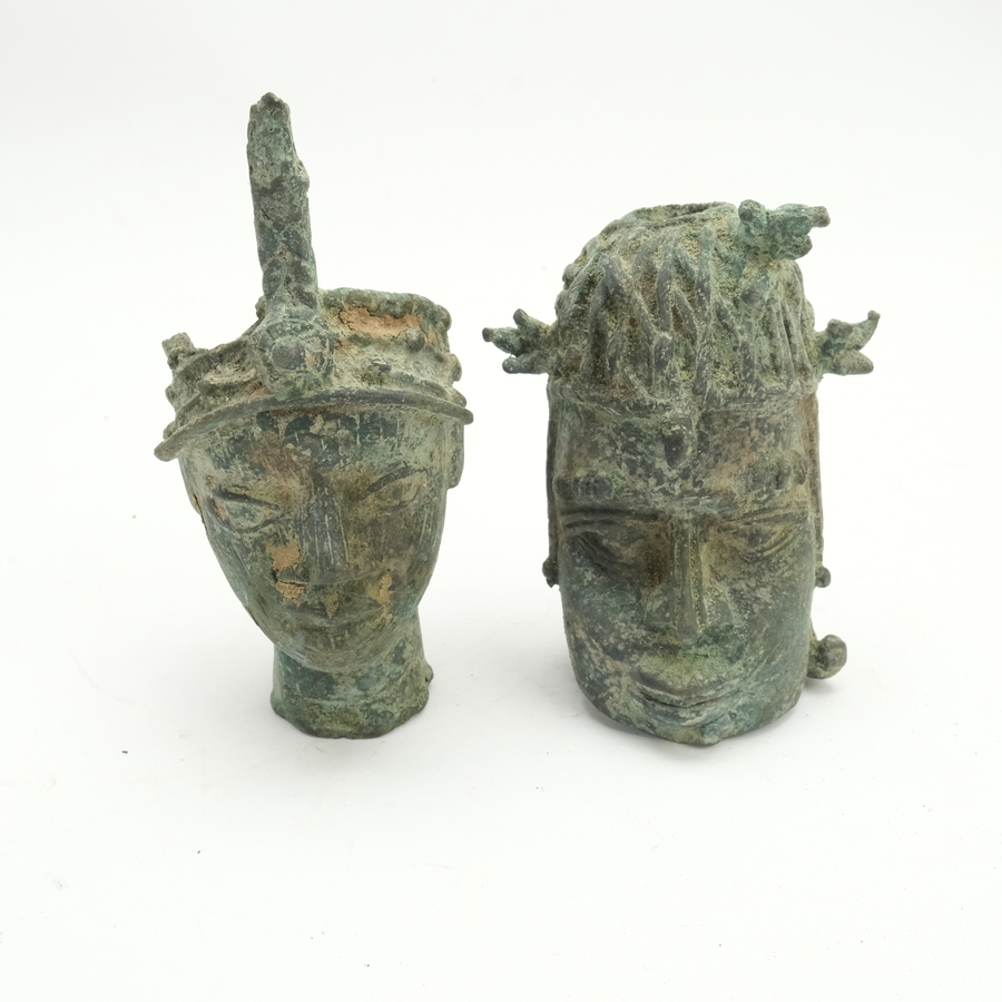Twee Benin bronzen bustes, zgn altaar hoofden. Beide met hoofdtooien. 20e eeuws