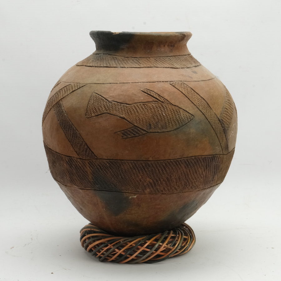Een Afrikaans terracotta kookpot met rondom ingekraste decoraties. 20e eeuws.