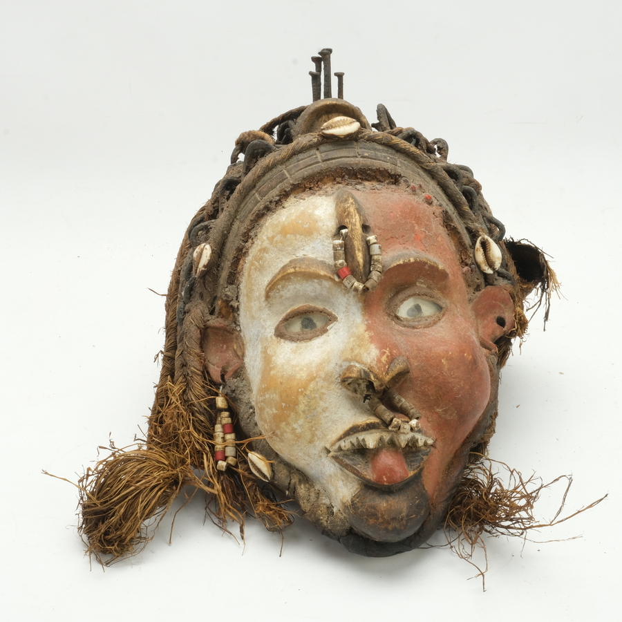 Een houten Afrikaans masker, deels beschilderd en met glazen ogen. Hoofdtooi versierd met spijkers, touw en stof.