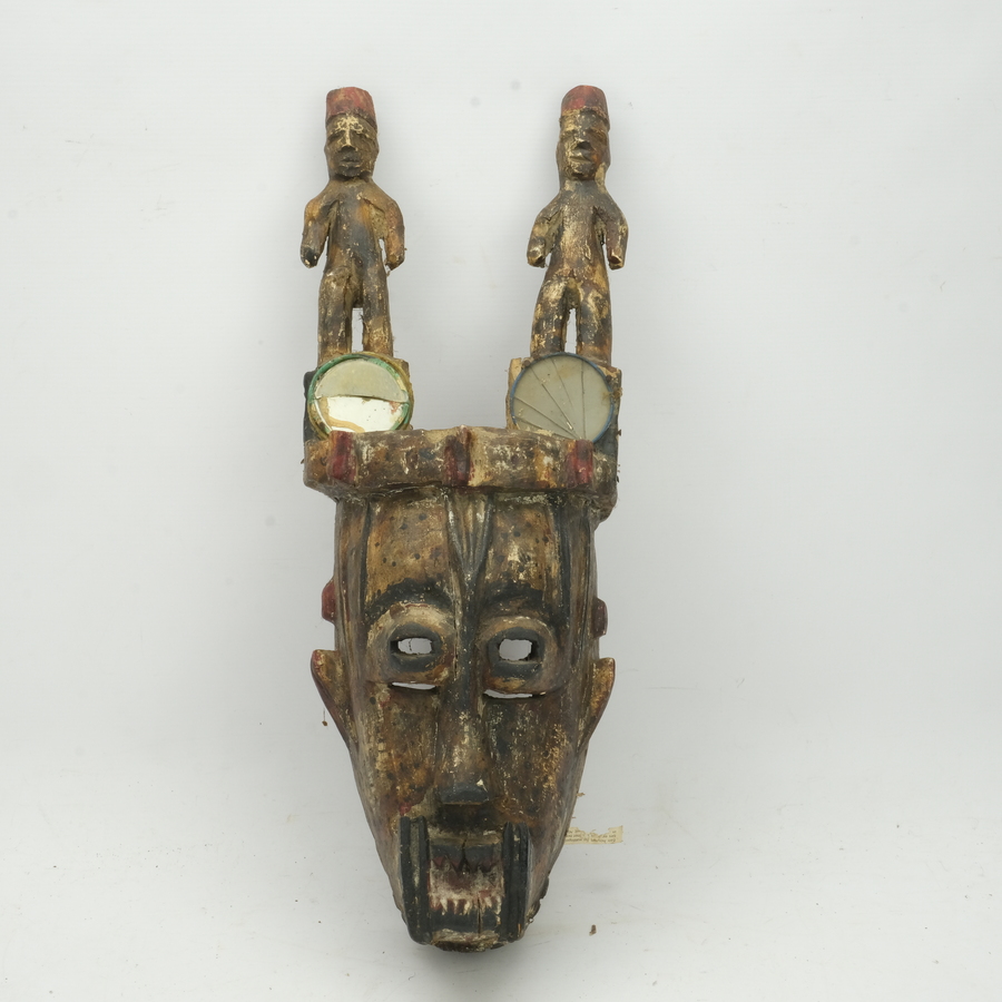 Een houten Afrikaans masker, deels beschilderd en met spiegeltjes gedecoreerd. Hoofdtooi is versierd met twee staande figuren. Volgens label een watersprintmasker uit Nigeria