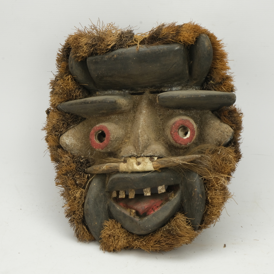Een houten Afrikaans masker, deels beschilderd en rondom met cocos haar omkleed. Bafo stam, Kameroen