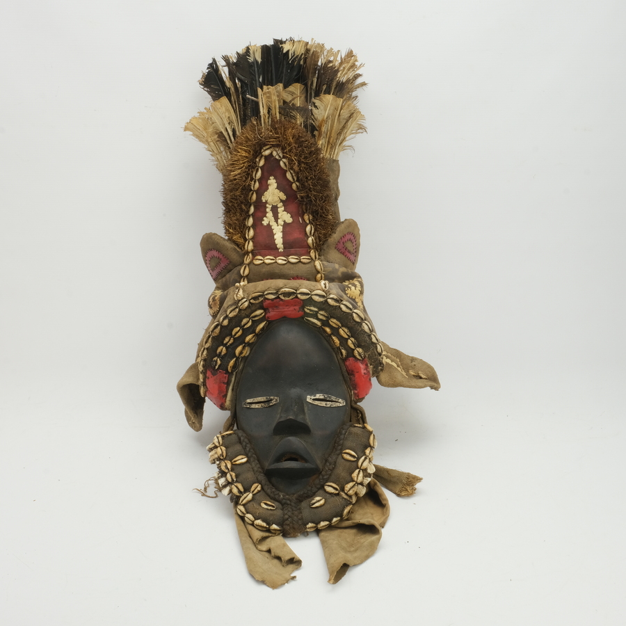 Een houten Afrikaans houten masker met stoffen hoofdtooi versierd met veren en schelpen