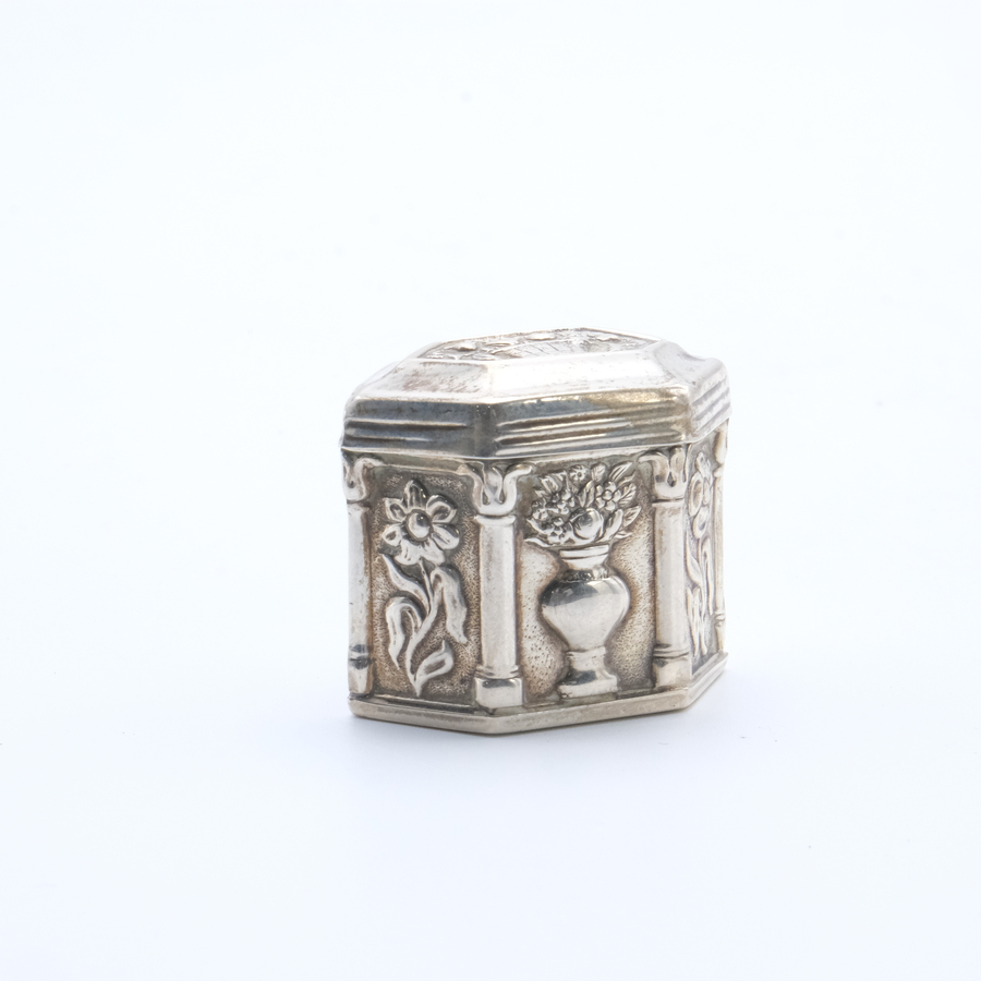 Een 20e eeuwse tweede gehalte (835/1000) zilveren lodereindoosje met decor van bloemen en bloemenvazen tussen pilaren