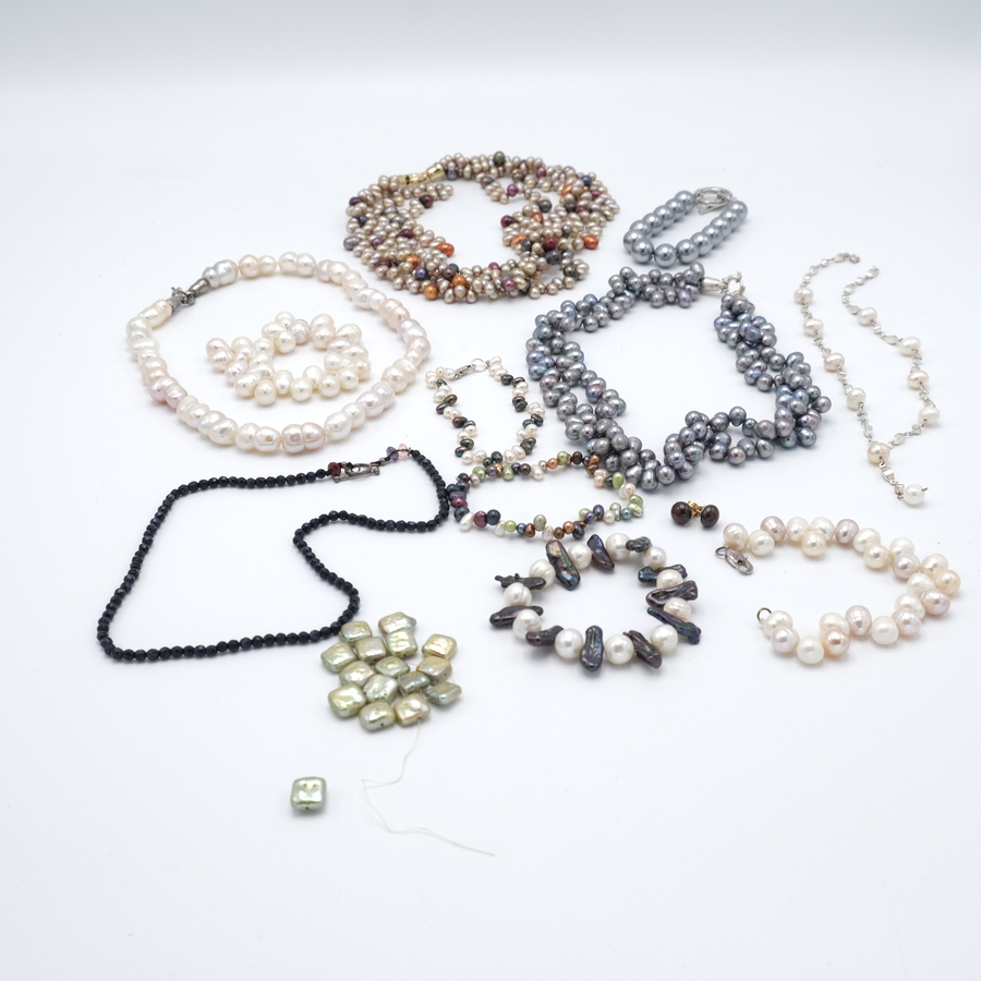 Lot diverse sieraden met parels, onder andere colliers, armbanden en oorknoppen.