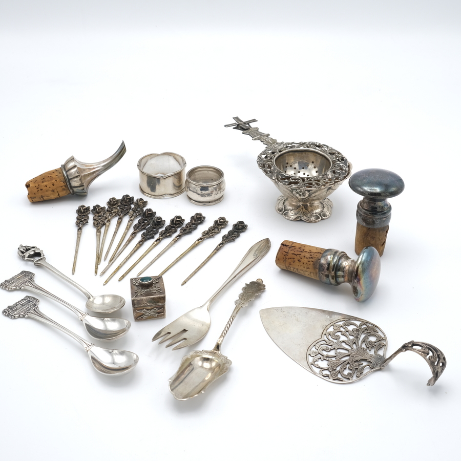 Een lot divers zilver, bestaande uit tweede gehalte (835/1000) zilveren schenktuit, twee servetringen, opengewerkt taartschapje, drie theelepeltjes, suikerschepje, vorkje, elf cocktailprikkers, ...
