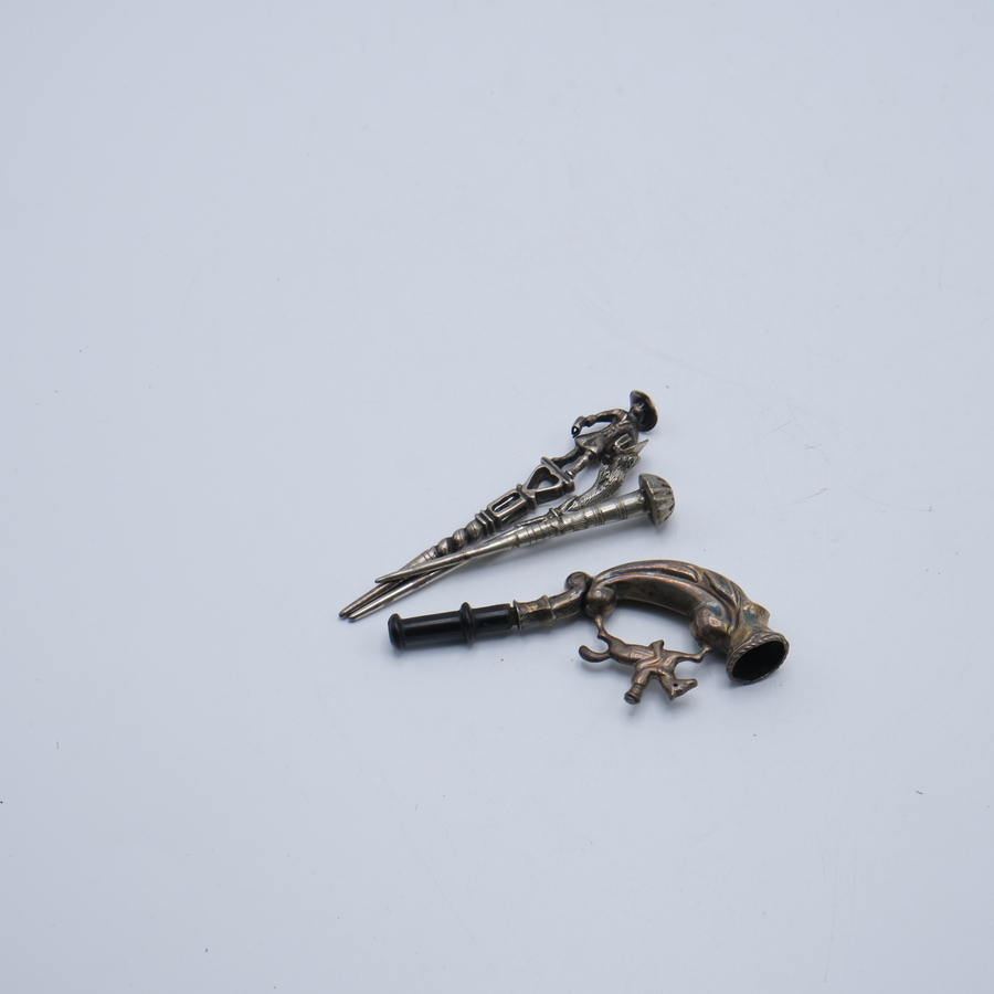 Drie 2e gehalte 835/1000 zilveren pijpenpluisers bekroond met een manfiguur, knop en hoef. Hierbij een zilveren sigarettenpijpje bekroond met een ruiter. 19e eeuws.