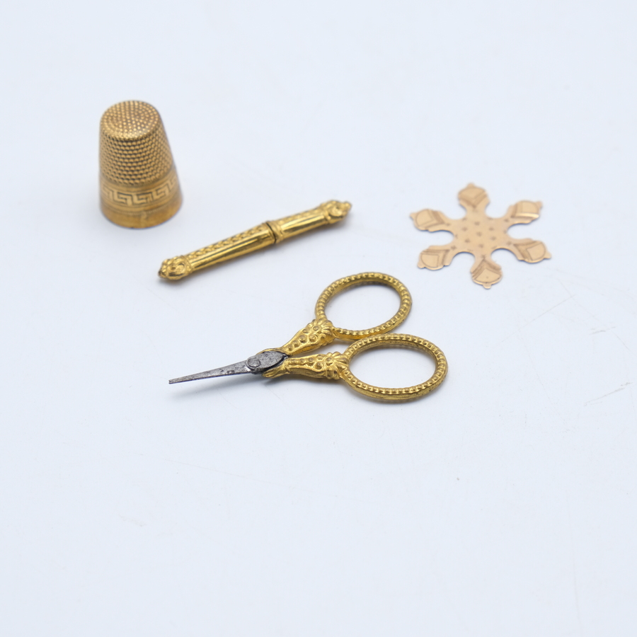 Een vierdelig naaigarnituur, bestaande uit een vergulde schaar, vingerhoed, naaldenkoker en een 14 krt rose gouden gegraveerde garenspoel in de vorm van een ster.
