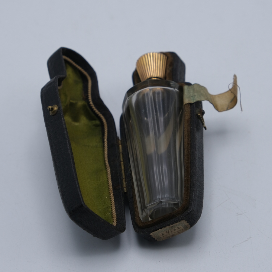 Een antiek kristallen parfumflacon met een 14 krt gouden dop. Met origineel glazen stopje en in foedraal.
