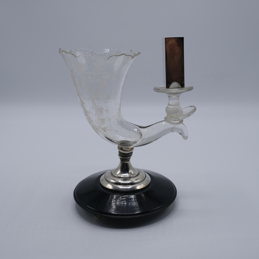 Kristallen hoorn des overvloeds, geplaatst op zilveren voet met zwart basement en zilveren luciferhouder.